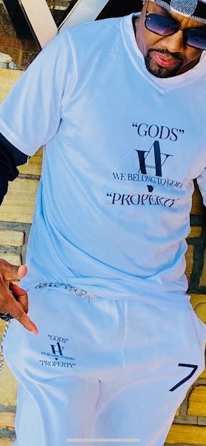 (GODS) Property Crisp White T-shirt with Sweatpants and BLESSED 7 Of PERFECTION. $50.00