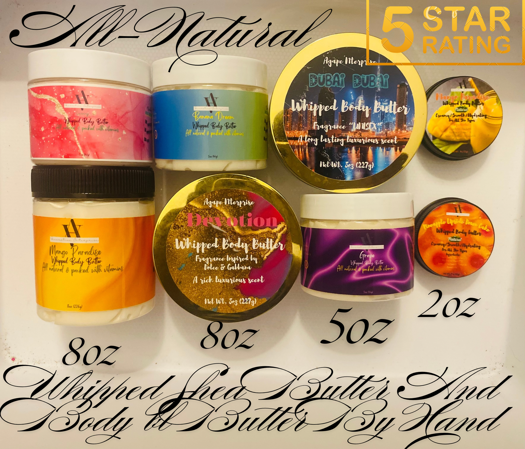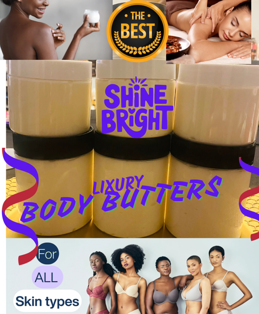 Let our AMAZING Body Butters help your Skin Shine Bright, and keep it Deeply moisturized and nourished in rough areas like your elbows, knees, and heels. Body Butters can be used for massages, stretch marks and all dry skin issues and will keep your skin BEAUTIFUL, Hydrated and Soft. We have Many Different Varieties to Choose from…….7